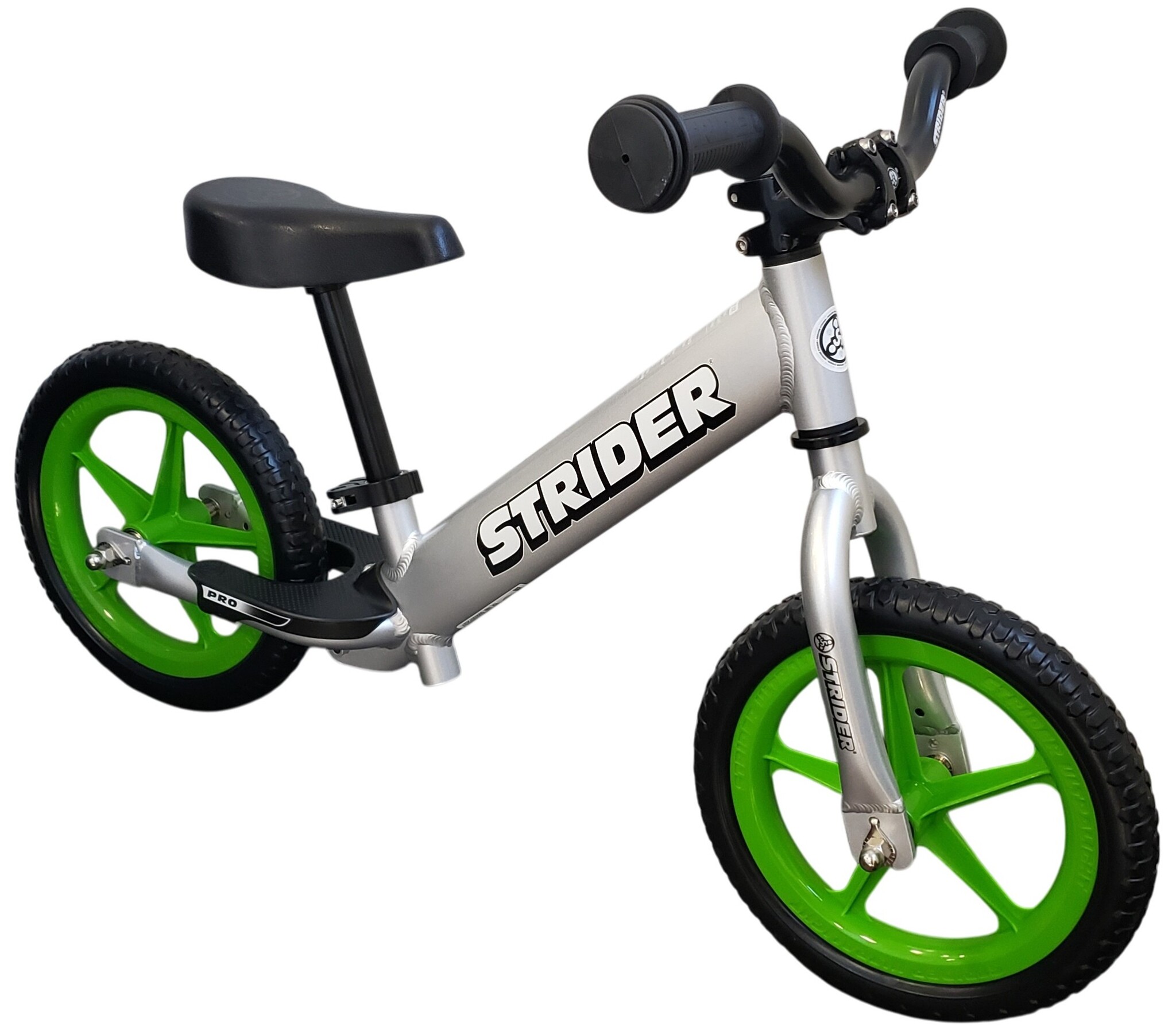 Strider 12" PRO balance bicycle SILVER frame w/ GREEN wheels